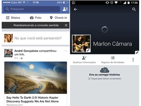 Ao iniciar o app de Facebook no iPhone, a timeline apresenta uma mensagem de "Erro ao carregar histórias". No Android, o ícone de "carregando" permanece indefinidamente na tela, sem que nenhum post ou foto apareça. Uma vez que a falha afeta o domínio, as chamadas telefônicas via internet também são afetadas.