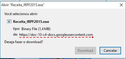 A tela apresentada no Facebook mistura um link verdadeiro da Receita Federal e um falso, que baixa um programa para o computador dos desavisados. Por segurança, o Fisco alerta que os programas, como o gerador do Imposto de Renda, por exemplo, devem ser obtidos diretamente na página da RFB na internet. No caso do programa que é disponibilizado na mensagem falsa, um olhar mais atento permite verificar que o servidor de aplicativos não é o da Receita Federal (como na linha tracejada em vermelho).