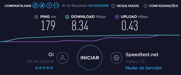 A primeira medição realizada é da taxa de download e em seguida da taxa de upload. Ao final da medição será exibida uma imagem conforme exemplo abaixo: