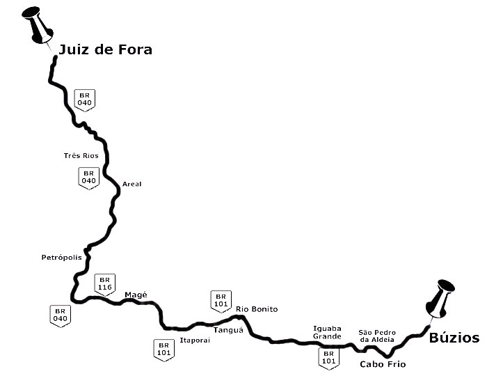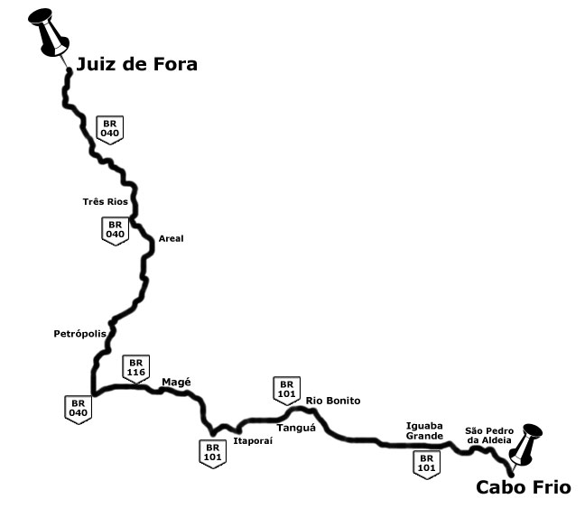 O Portal ACESSA.com levantou a condição das estradas que ligam Juiz de Fora a dez cidades dos litorais carioca, capixaba e paulista. As informações foram obtidas por meio do Departamento Nacional de Infraestrutura de Trânsito (DNIT) e dos Departamentos de Estradas e Rodagem (DER) de cada Estado. Clique no nome da estrada desejada para conferir a situação de tráfego. Para visualizar o trajeto em tamanho maior, clique nas imagens do lado direito.