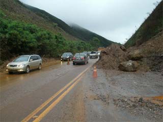 De acordo com o inspetor da Polícia Rodoviária Federal (PRF), Luís Heleno Lima Corrêa, um dos pontos de maior retenção no estado foi no Km 583, da BR-040, próximo a Itabirito, onde houve uma queda de barreira (foto acima). "Tivemos um transtorno muito grande na região. O trânsito era liberado por alguns momentos e depois bloqueado novamente. Foi um trabalho difícil e que afetou os juiz-foranos que se deslocaram para a região de Congonhas."