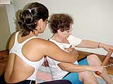 A t?cnica d? ?nfase tamb?m ao trabalho respirat?rio. A cada movimento, Andr?a aconselha, "inspira, expira". A professora est? sempre acompanhando o desenvolvimento dos alunos. Os exerc?cios s?o observados atentamente.