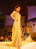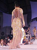J? para a candidata do Tocantins, Michelli criou modelos para as duas categorias: t?pico e gala. O modelo dourado frente ?nica em pedras svarovski (foto ? direita) custou R$ 15 mil.