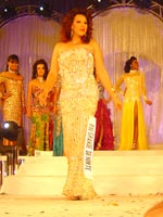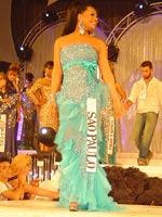A candidata do Rio Grande do Norte, Raquel Nayla (foto ao centro), tamb?m procurou Michelli para que ela cuidasse do seu look no ponto alto da noite. Para Raquel, Michelli criou um modelo em cetim bucol champanhe, com detalhes em renda gripin do mesmo tom, cravejados em rivoles, strass tchacos e cristais swarovski.