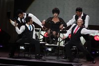 17/08/13 22:16 Termina o desfile de trajes t?picos. No palco, Ikaro Kadoshi apresenta uma performance baseada nos musicais da Brodway. Ele encanta o p?blico ao som de New York, New York.